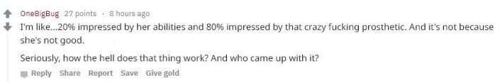 "Я скорее на 20 процентов впечатлен ее способностями и на 80 процентов - этим чертовски странным протезом. И это не потому, что она якобы плохо играет. Серьезно, как вообще эта штука работает? И кто ее придумал?"