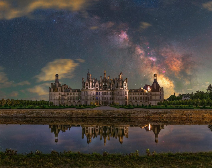 На фото изображен рассвет и исчезающий Млечный Путь над средневековым замком Шамбор в долине Луары, Франция.
