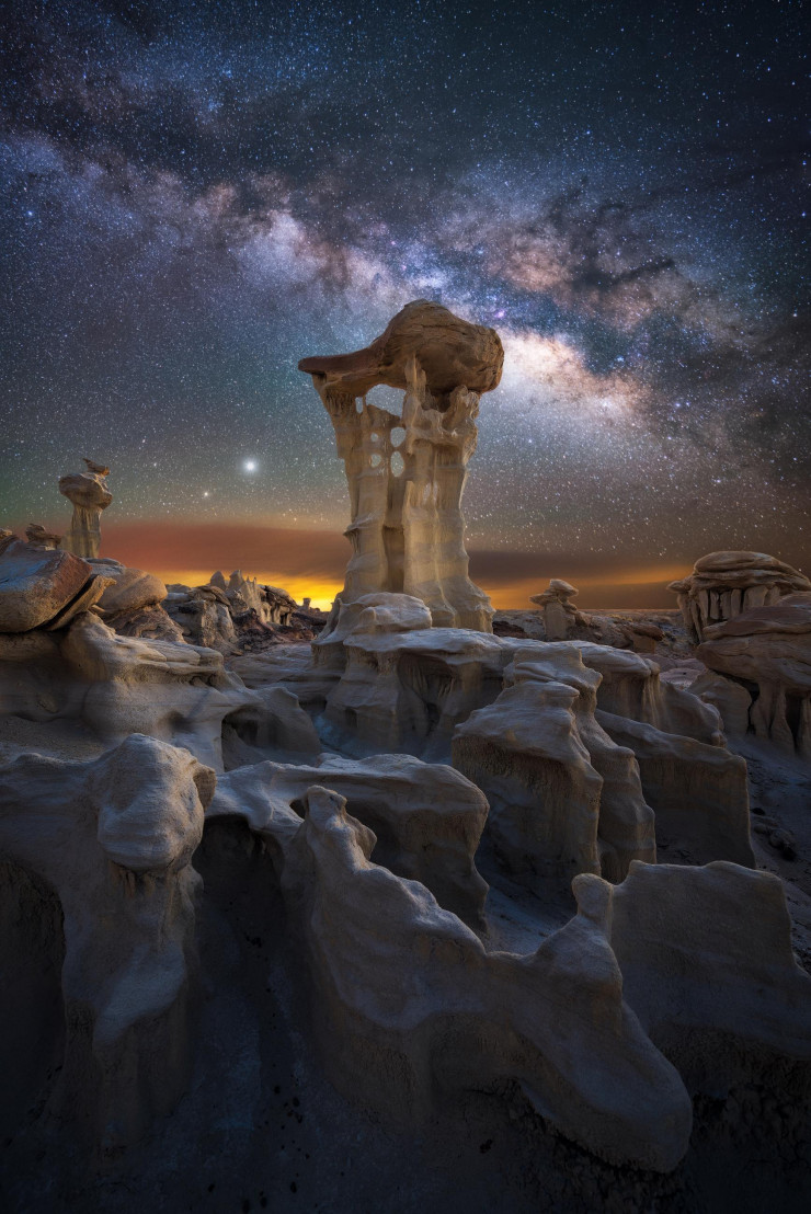 Каменный шпиль, также известный как Худу, поднимается из бесплодных земель, образуя идеальный передний план для Млечного Пути. Фото было сделано в пустыне Ах-Ши-Сле-Па на северо-западе штата Нью-Мексико.