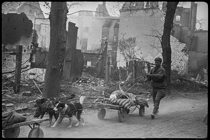 Вывоз раненых на собаках с поля боя. Германия, р-н Зееловских высот. Апрель, 1945 год.