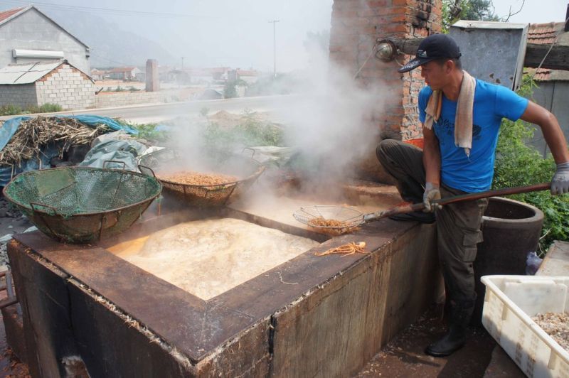 А далее все по технологии: свежевыловленные креветки опускают в чан на пару минут, туда же и заливают краситель. Позже креветок вымочат в растворе триполифосфата натрия. Триполифосфат натрия используется для фиксации свежести и для того, чтобы они лучше впитывали воду и становились тяжелее во время заморозки. Позже такую крашеную и пропитанную креветку отправляют на заморозку (глазировку). Иногда, по желанию заказчика, креветку не красят (такая креветка выходит дешевле (те некрашеные креветки, что на фото, пойдут на более дешевые снеки. А крашеная пойдет к нам на стол. Особенно много ее, рыженькой красавицы, в России и на Украине. Ну с крилем для снеков происходит практически то же самое, только его не будут вымачивать в триполифосфате, а после варки будут сразу сушить около пяти дней, в данном случае на земле. Потом эти креветки почистят (в сухом виде креветки начинают шелушиться и процесс чистки становится значительно легче, чем когда их чистишь сразу после варки), досушат и расфасуют.