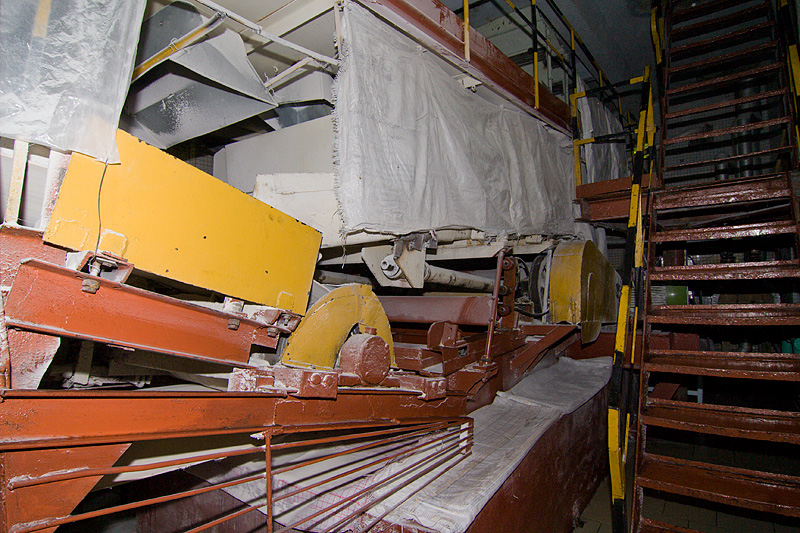 Высушенный и охлажденный сахар-песок подается на машину рассева. Фотография не передает движения, но вся конструкция колдыбается, как сито в руках у бабушки.