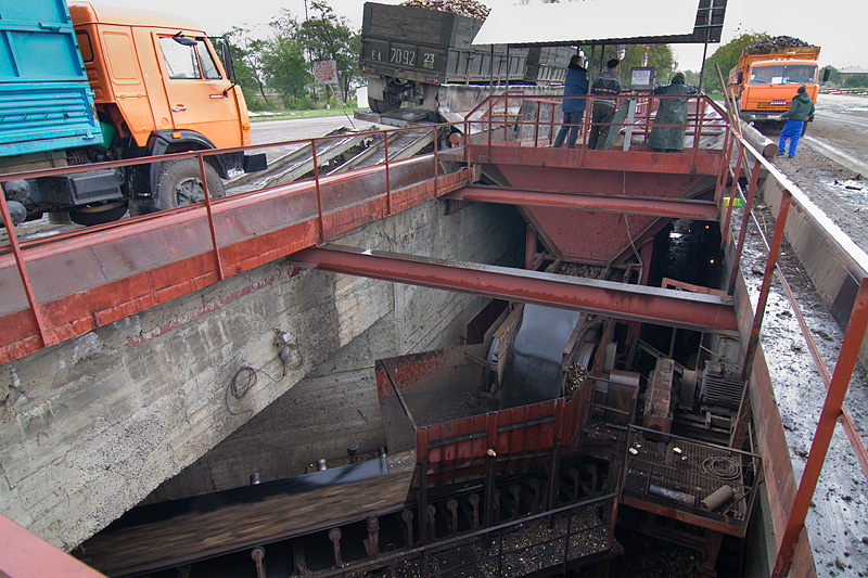 Взвешивают и затем разгружают содержимое кузовов и прицепов в бункер.