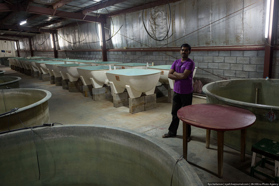 Небольшая справка про самого Юрия Киташина. Он бывший военный, 20 лет отслужил в советской армии и в начале 90-х, когда все у нас развалилось, уехал сначала в Сирию, потом в Саудовскую Аравию. В России было много попыток открыть аналогичную ферму, но его все либо обманывали, либо "посылали". Инвестировал в строительство фермы местный шейх, так что золотых гор на этом деле Юрий не зарабатывает. Вообще окупаемость такого дела лет 10.