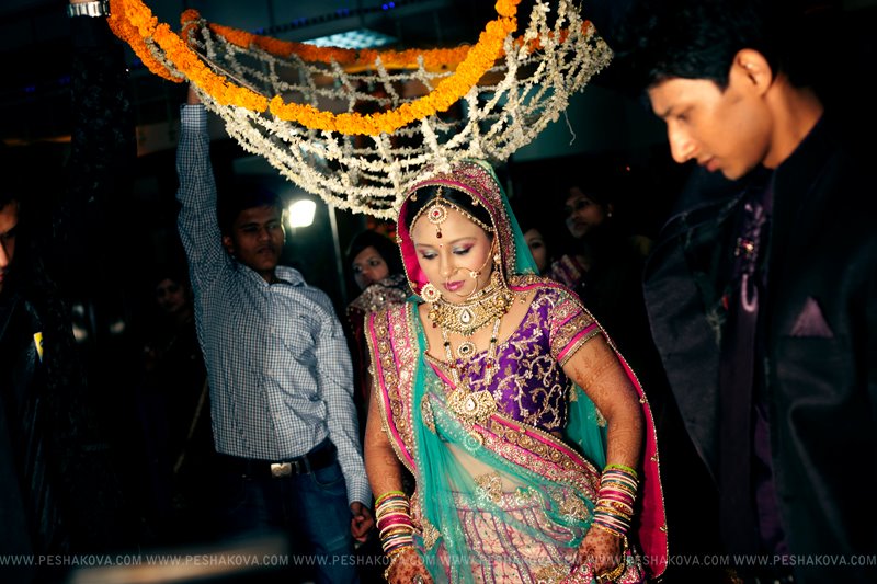 Держа в руках гирлянду из цветов, первый раз они поднимают глаза, чтобы посмотреть друг на друга. Это время для первой символической церемонии обмена гирляндами - джаймала.