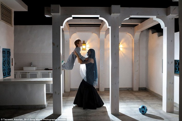 Дизайнер одежды Нассиба играет со своим сыном, Джидда, Саудовская Аравия.