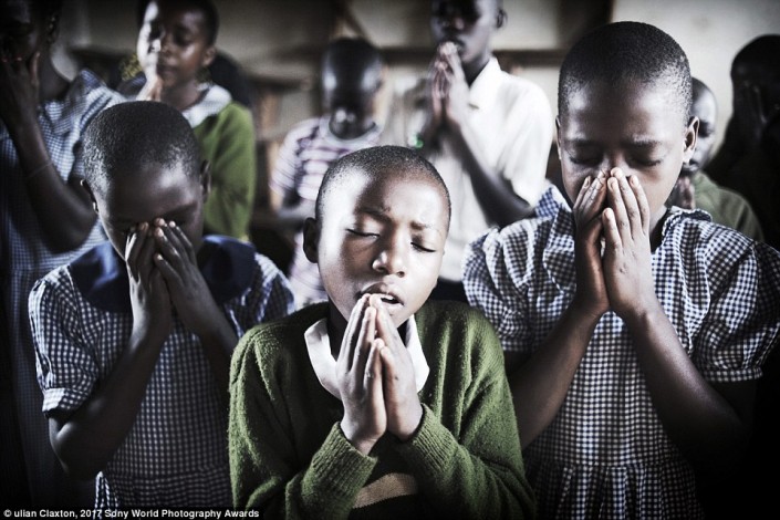 Дети молятся перед занятиями в деревенской школе, Уганда.