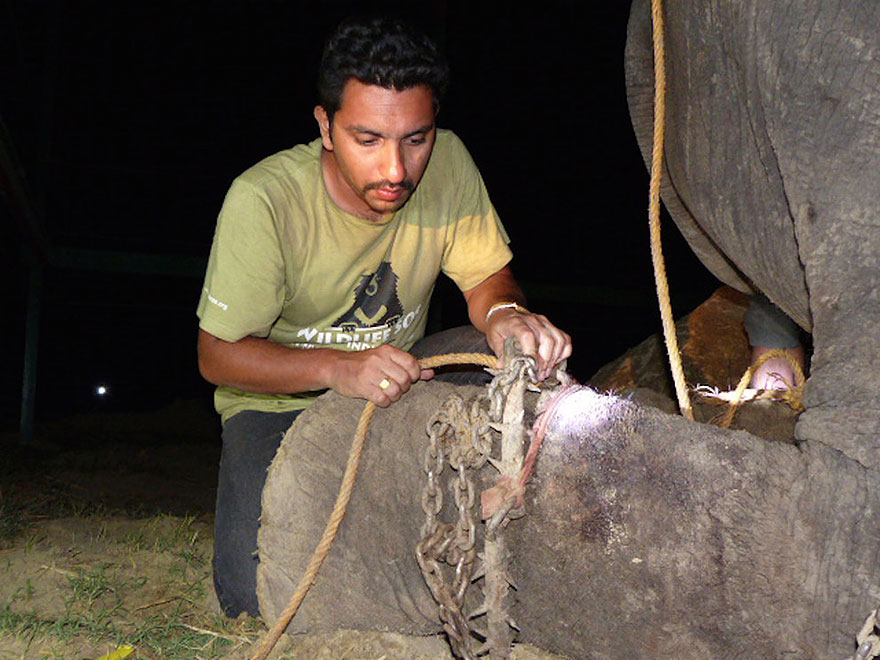 Трогательный момент, когда слон встал на колени, чтобы с него сняли кандалы. Цепи обвивали ноги слона так плотно, что на освобождение от них ушло 45 минут. Когда слон почувствовал себя спасенным, то из глаз у него полились слезы: "Он оказался невероятно чувствительным. Было ясно - слон понимает, что его спасают. Он начал плакать, как ребенок. Впервые в жизни у него появилась надежда", - рассказали спасатели.