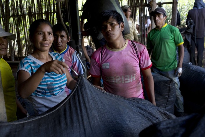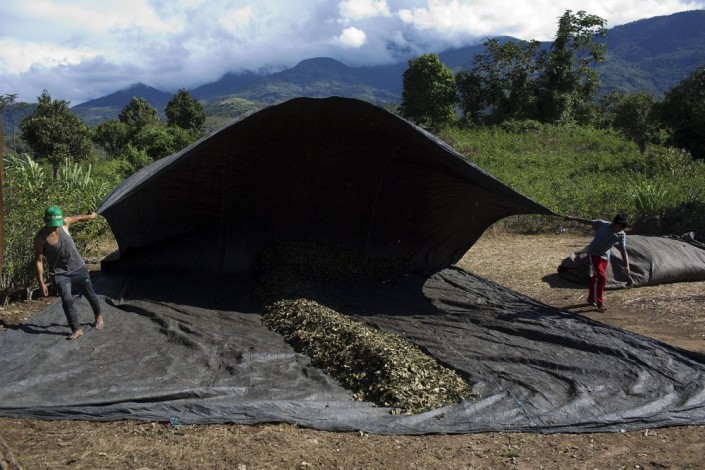 Молодые люди накрывают листья коки брезентом, чтобы они просушились. Владельцы плантаций продают оптовикам килограмм листьев коки за 3,5 доллара, а те поставляют их наркоторговцам. Это в два раза больше, чем зарабатывают фермеры, выращивающие кофе или какао.