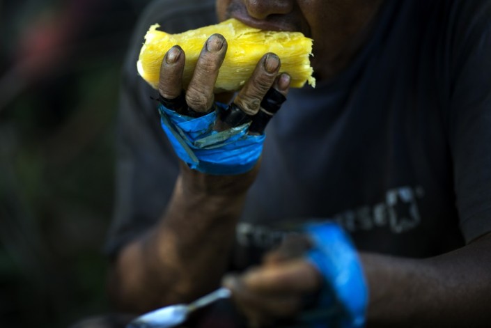 50-летний сборщик коки Роберто Вига ест вареную юкку во время перерыва на обед. Практически все собранные листья коки оказываются сырьем для кокаина, и местные жители переживают, что правительство в итоге начнет уничтожать урожаи.