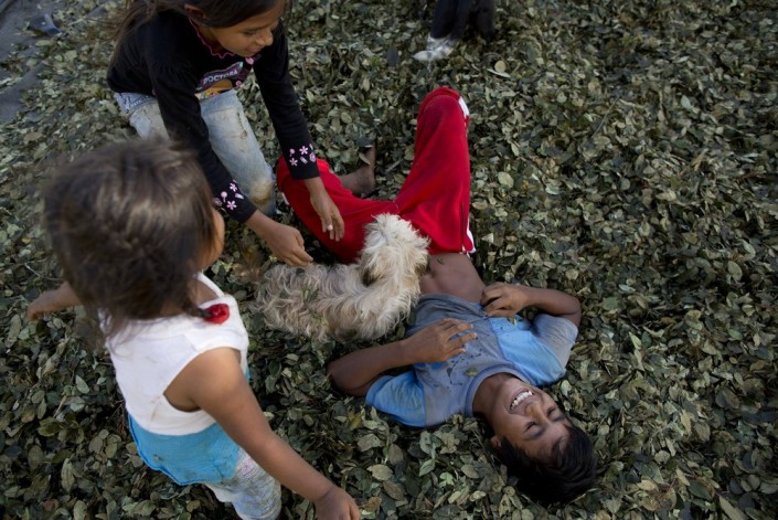 Дети играют на куче листьев коки, помогая родителям собирать урожай. Согласно официальной статистике, более двух третей граждан Перу живет за чертой бедности, а хроническое недоедание поражает около половины детей до пяти лет.