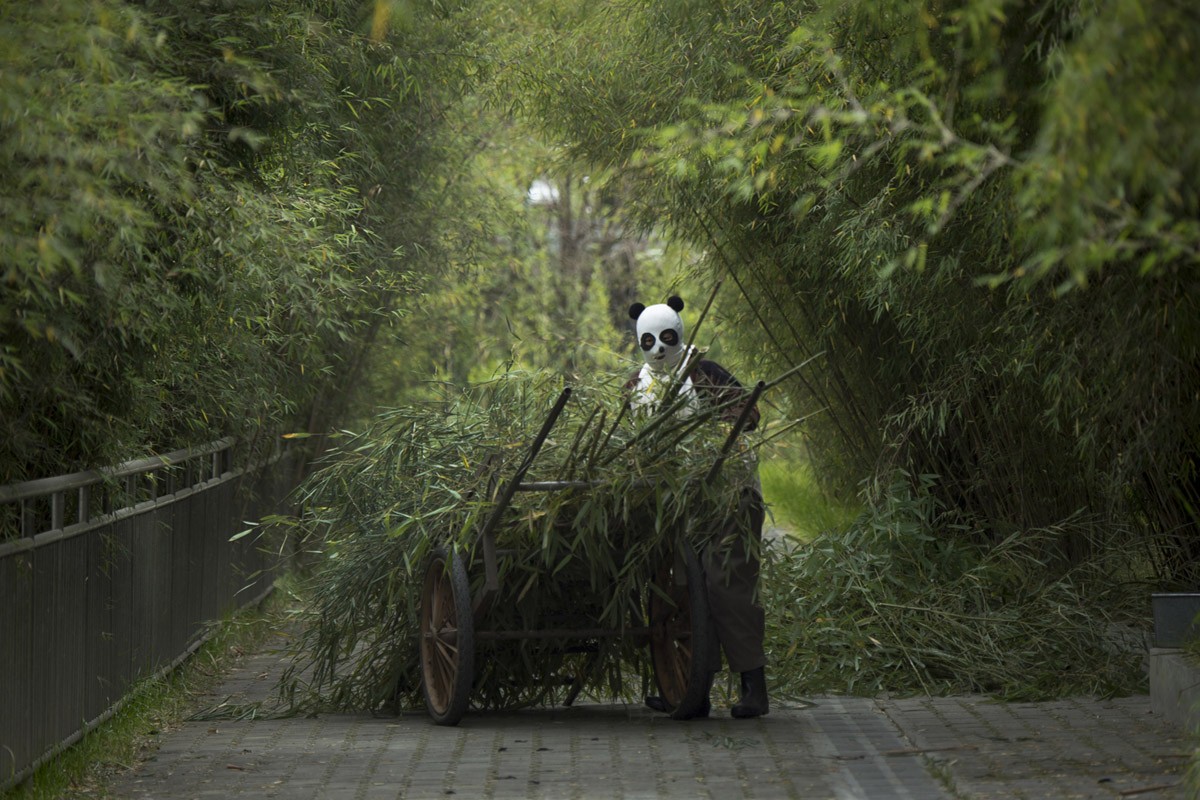 Работник центра везет бамбук пандам, которых готовят к жизни в дикой природе. Смотрители заповедника должны одеваться в костюмы панд, чтобы животные не видели человека до того, как их выпустят на волю.