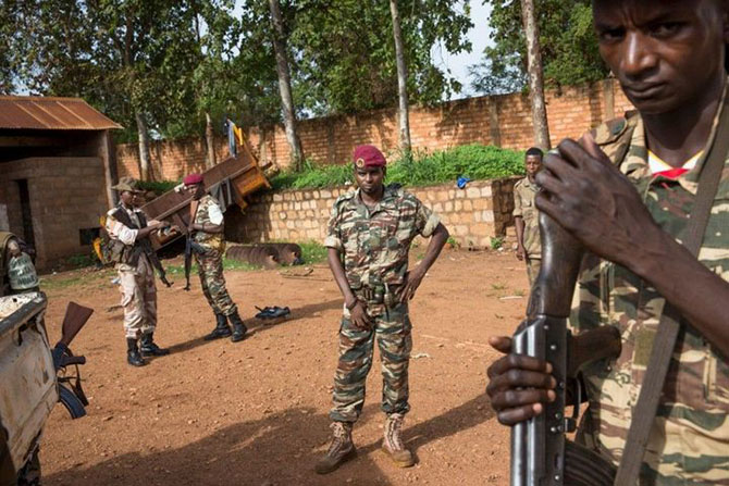 Боец группировки "Селека" стоит в дозоре возле своей базы в Бамбари.