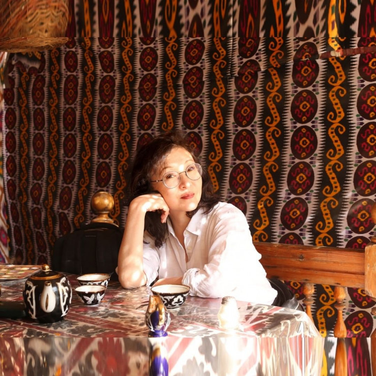 Перформанс проекта "Мой Шелковый путь к тебе" на выставке в проекте Uly dala hikayalary в 2018 году в Шымкенте, в образе Молдир Зияева. ©Алмагуль Менлибаева