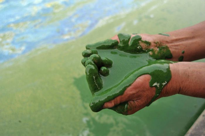 Мертвая рыба в воде, заросшей голубоватыми водорослями. Ист-Лейк, Ухань.