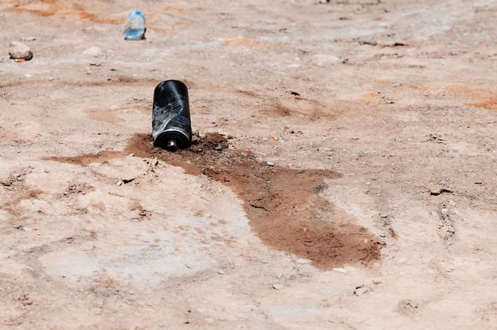 Женщина собирает пластиковые бутылки возле загрязненной речушки, окрашенной в красный цвет.