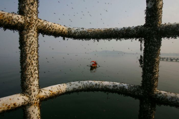 Мухи облепили железную конструкцию над загрязненным водоемом в Ухане.