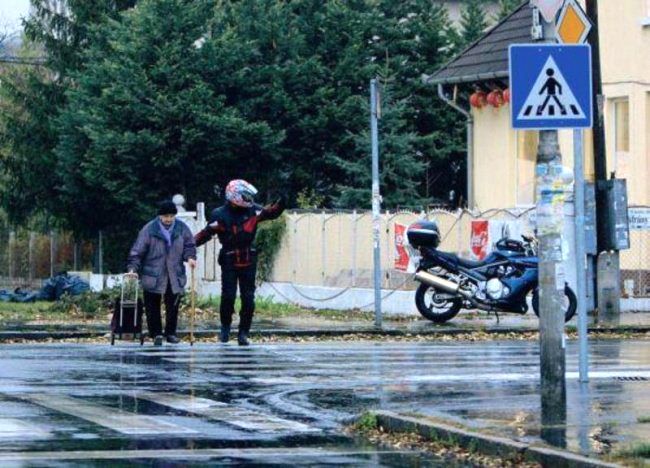 Мотоциклист остановился, чтобы перевести бабушку через дорогу.