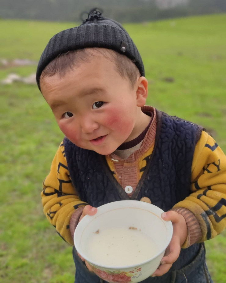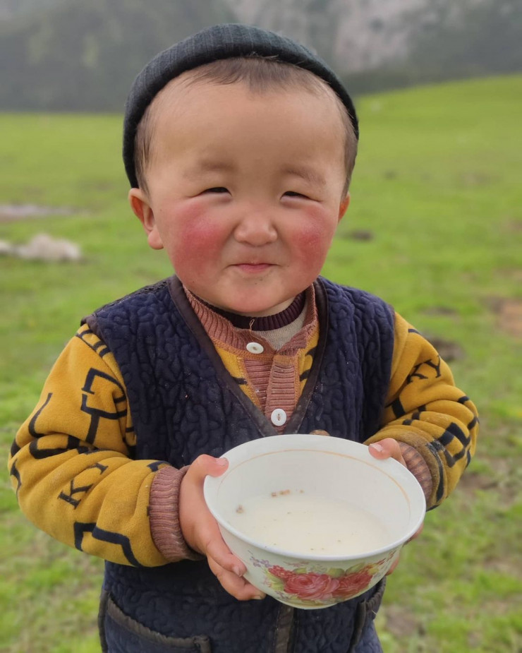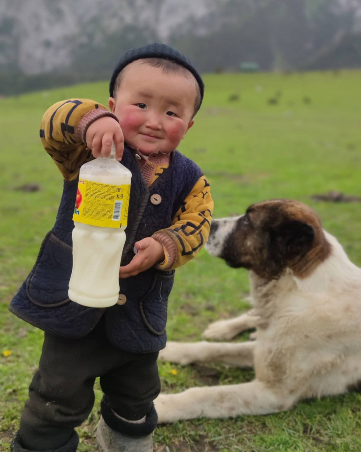 Снимок маленького Гайлани фотограф сделал, когда он и его друзья гуляли по просторам жайляу в Ноокатском районе и проходили мимо юрты, где живет мальчик со своей семьей. Мальчик угостил Зафера и его друзей свежим кумысом, и сам попробовал напиток. Фотограф не упустил возможность заснять на фото мальчика и его собаку.
