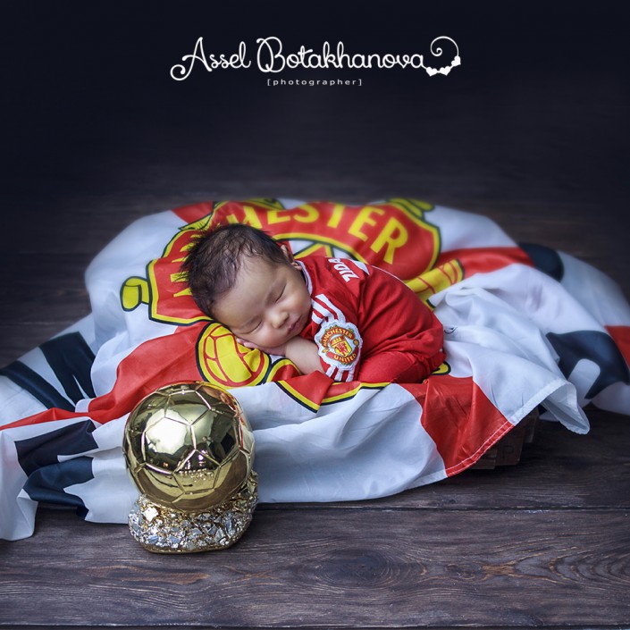 А на следующем снимке малыш по имени Зидан. "Мне стало интересно, почему у мальчика такое необычное имя. Оказалось, папа любит футбол, болеет за ФК из Стретфорда "Манчестер Юнайтед". Тогда мы решили все это смиксовать. Я сшила для него футбольную форму с логотипом Манчестера и указала на экипировке счастливый номер 7 с его именем. Фото получилось символичное", - объясняет Асель.