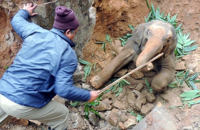 Пассажиры поезда увидели, что слоненок провалился в яму, и уговорили машиниста остановиться и помочь ему. Пока ждали помощь, люди подкармливали его листьями, а приехавшие спасатели вытащили животное.