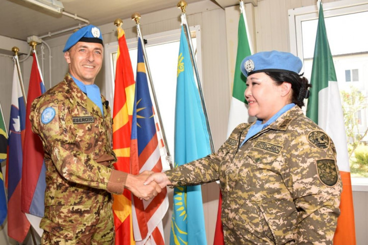 Командующий сектором генерал Бруно Пишота и полковник Диля Ахметова. Церемония водружения флага РК в штаб-квартире сектора "Запад", UNP 2-3, Шама, Ливан, май 2019 года