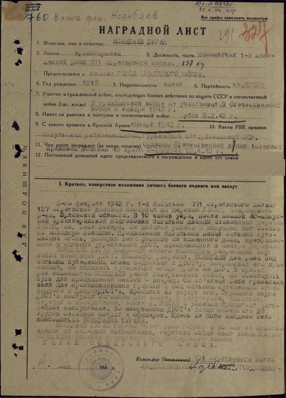 С фамилией героя тоже вышла путаница, ее считали труднопроизносимой, что усложнило поиски казахстанца. Даже в наградном листе его называют Исынбаевым.