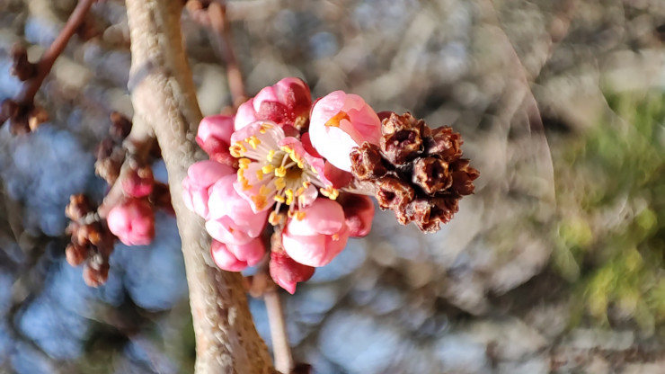 "Это самые первые цветочки, видно, что только начали распускаться, а некоторые еще закрыты. В этом году на неделю позже началось цветение урюка в сравнении с прошлой весной. В прошлом году я делал подобные фото 27 марта в этом же месте", - добавил Дмитрий.