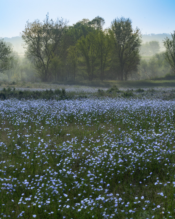 Фотограф удивлен, почему лен пока не пользуется такой популярностью у любителей фотосессий, как маки. Хотя цветение очень красивое. Это некий противовес макам: если они такие яркие и контрастные, то лен, наоборот, спокойный, с нежно-голубым оттенком.