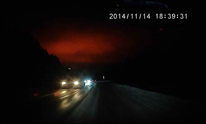 На кадрах видно, как водитель едет по заснеженной трассе в темное время суток. Затем небосклон внезапно озаряется гигантским ярким свечением, которое длится всего несколько секунд. При этом явление не сопровождается каким-либо звуком.
