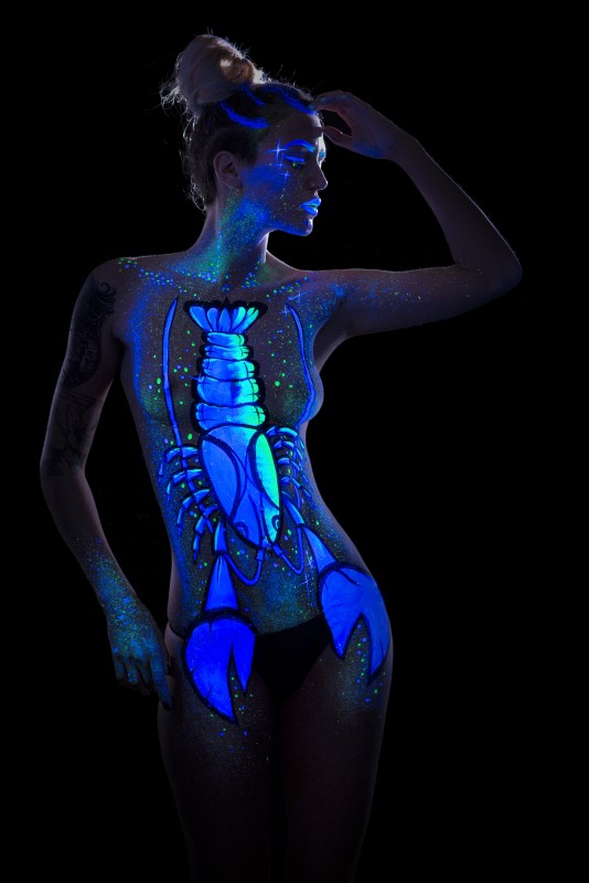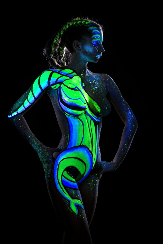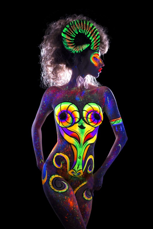 Чтобы перенести космическое "волшебство" на тела моделей, было решено использовать неоновые краски, которые светятся в темноте при специальных УФ лампах. Студия для съемок подготавливалась с особой тщательностью, дабы не потерять естественный силуэт тел и при этом сохранить эффект свечения.