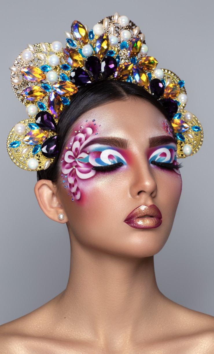 "На чемпионате мира по макияжу было шесть номинаций, можно было участвовать в любой из них и сделать по критериям заданную работу. Одна из моих номинаций включала рисунок на лице. Этот вектор я сравниваю с яйцами Фаберже, то есть она должна быть очень точной и детальной работой, яркой в цвете, симметричной в пропорциях на две половины лица, глаз должен быть красиво оформлен с рисунком, со сложными техническими элементами.