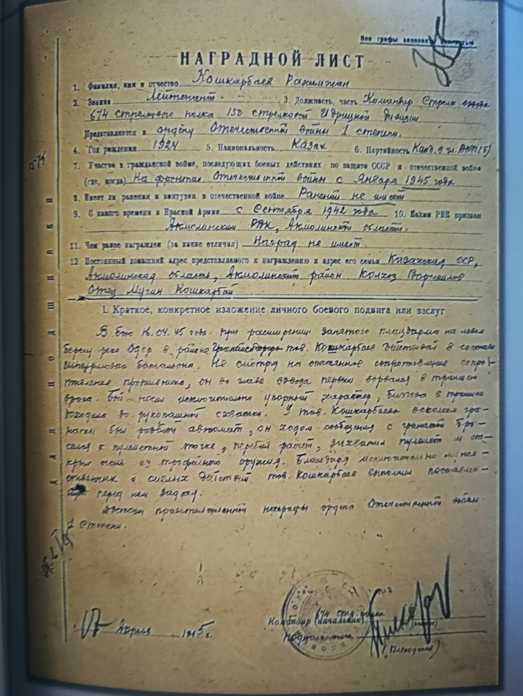 "Выпускник Фрунзенского военного пехотного училища младший лейтенант Кошкарбаев Рахимжан назначается командиром стрелкового взвода. В действующей армии с января 1945 года. Наград и ранений не имеет. Назначается с 15 февраля 1945 года вместо младшего лейтенанта Кордюкова Алексея Юрьевича, погибшего в бою 15 февраля 1945 года", - говорится в документе.