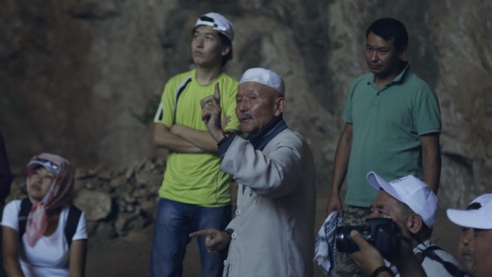 Читает молитвы и рассказывает туристам о пещере местный аксакал Аскар.