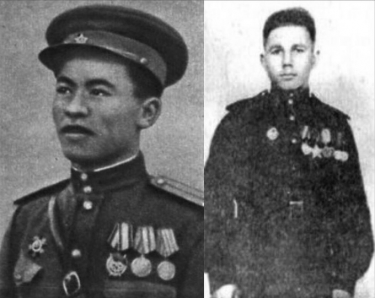 На фото слева направо: младший сержант М. Кантария, сержант М. Егоров, лейтенант Рахимжан Кошкарбаев, капитан С. Неустроев
