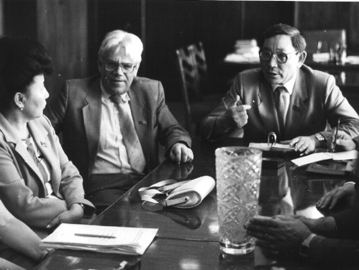 Министр образования СССР Г.А.Ягодин и зам.Председателя СовМина КазССР М.М.Ахметова с членом-корреспондентом АН КазССР Е.Е.Ергожиным, 1987 год.