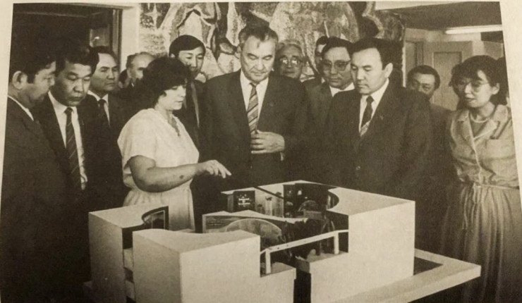 Сотрудники КазГУ демонстрируют проект строительства в вузе члену Политбюро ЦК КПСС, первому секретарю ЦК Компартии КазССР Динмухамеду Кунаеву, секретарю ЦК Компартии КазССР Нурсултану Назарбаеву и другим гостям, 1983 год
