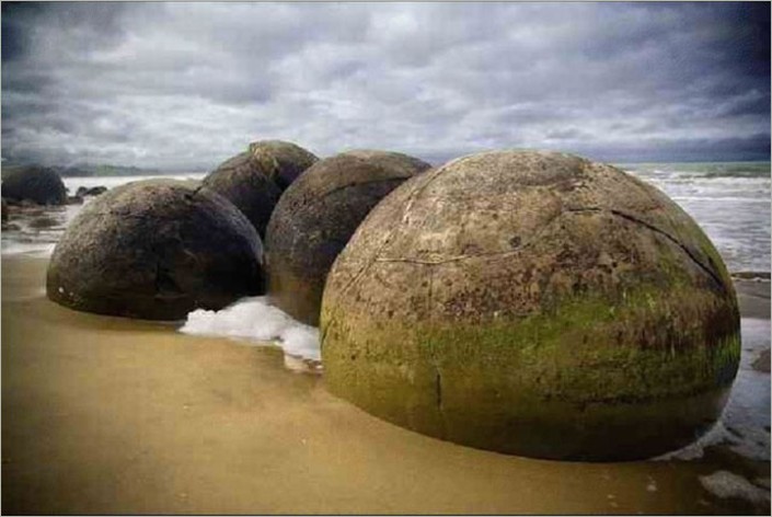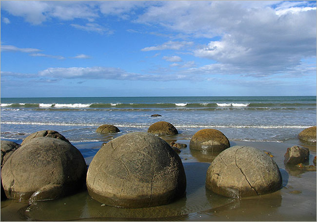 В Новой Зеландии шары в песках пляжа вдоль побережья омываются морским прибоем.