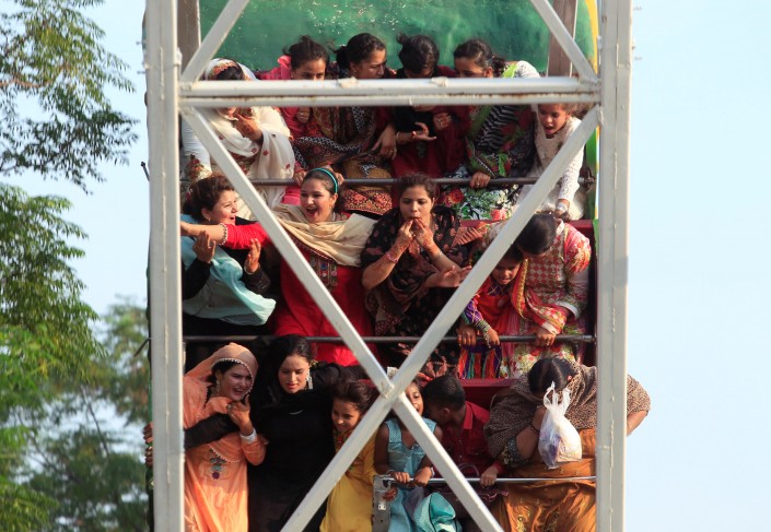 Люди катаются на аттракционах во время ярмарки, посвященной окончанию поста. Равалпинди, Пакистан.