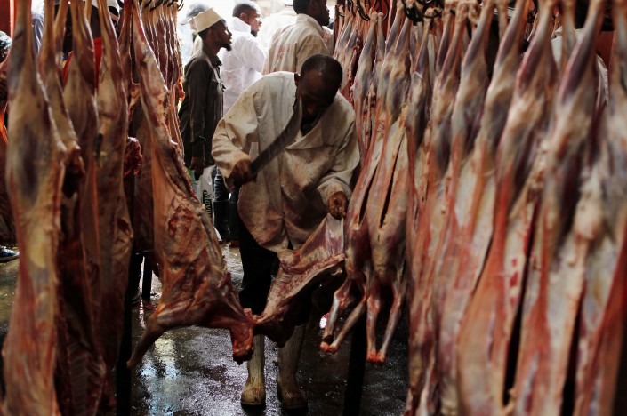 Мясник разделывает козье мясо на бойне, чтобы отметить окончание поста. Найроби, Кения.
