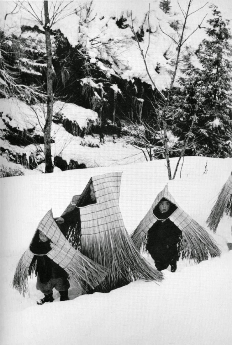 #19 Дети с соломенными накидками для защиты от непогоды идут на новогоднее мероприятие. Ниигата, Япония, 1956. ©Хироси Хамая