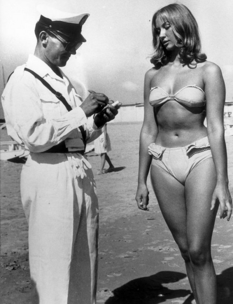 #14 Полицейский выписывает штраф за ношение бикини на пляже в Римини, Италия, 1957. Автор неизвестен