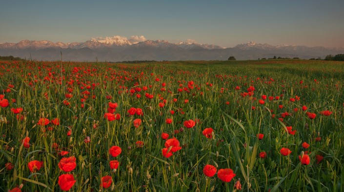 Маковые поля Алматинской области, на заднем плане пик Талгар (4973 м) – высшая точка Заилийского Алатау. Май, 2018 год. © Ольга Кулакова.
