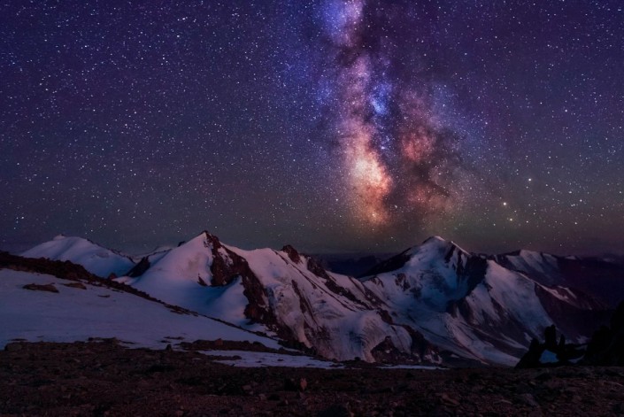 Ночь на вершине пика Молодежный (4147 м), Малое Алматинское ущелье, Заилийский Алатау. Слева направо: пик Погребецкого (4231 м), пик Локомотив (4182 м), пик Горельник (4000 м), пик Советов (4317 м). Август, 2016 год. © Ольга Кулакова.