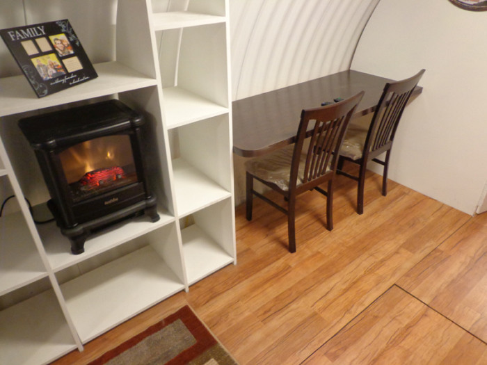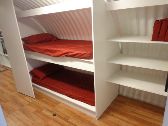 В убежище имеется все необходимое, чтобы прожить автономно несколько дней или больше - все зависит от объема накопленных запасов. Если присмотреться внимательно к интерьеру дома, то мы увидим, что в цилиндрический, вытянутый объем жилища вписан параллелепипед из полок, внутренней отделки, двухъярусных кроватей с рундуками, напольного покрытия. Трубы и прочие коммуникации упрятаны под пол. Здесь есть функциональные зоны прихожей, гостиной, спальни, кухни-столовой, а также системы хранения, душевая и санузел.