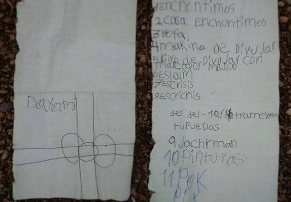 Затем он заметил, что к ленте шарика привязан кусочек бумаги. То была записка, на одной стороне которой детским почерком написали имя Дайами, а на другой - список вещей на испанском языке.