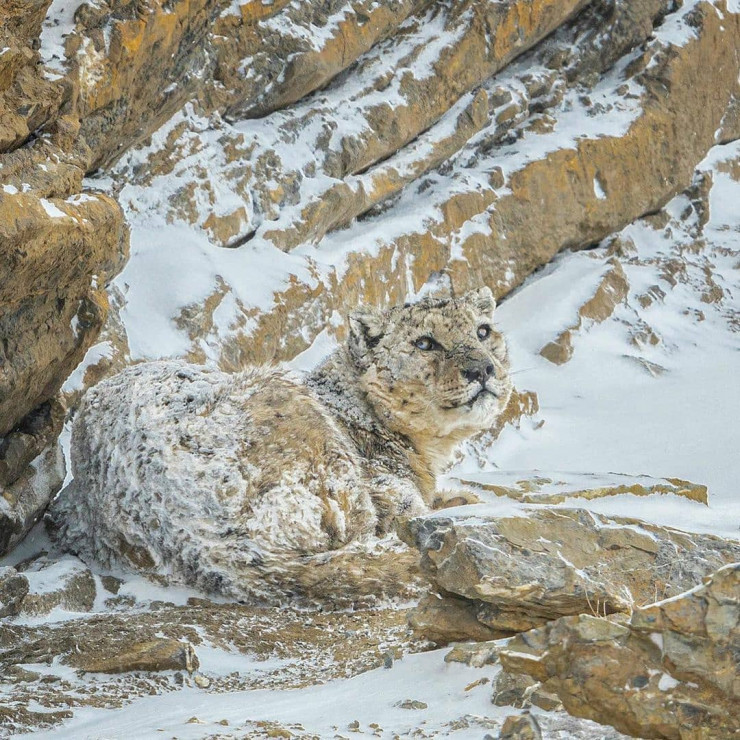 На фотографии запечатлен снежный барс, лежащий на заснеженных скалах. Снежные барсы преимущественно обитают в скалистых горных регионах Центральной и Южной Азии. Численность животного с каждым годом уменьшается, поэтому прирожденный дар маскировки позволяет зверю скрываться от посторонних глаз, а также незаметно выслеживать добычу.