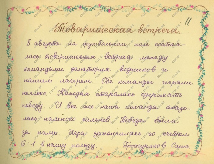 Завершая фотопутешествие в пионерские лагеря Казахстана послевоенных лет, хотелось бы отметить, что, публикуя данную статью, мы не ставили себе целью акцентировать внимание на политико-идеологических моментах в деле организации пионерских лагерей. Напротив, попытались показать через хранящиеся на архивных полках документы - фотографии и яркие воспоминания детей, достигших в наше время статуса бабушек и дедушек, что организация отдыха и досуга детей на время летних каникул всегда должна быть в поле зрения руководителей всех уровней и масштабов, вне зависимости от времени и общественно-политического строя государства, как один из актуальных вопросов в деле воспитания подрастающего поколения.