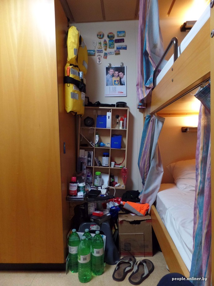 Что сказать… Порт там прямо в поле. Вокруг пустота, глазу не на чем задержаться. Думаю: куда я попал? А потом было первое знакомство с каютой, и снова шок: разве здесь можно провести хотя бы месяц?.. Нас водили по лайнерам, но в жилую часть мы не заглядывали, чтобы не мешать команде. И вот захожу в каюту - а она, мягко говоря, небольшая. Стоит двухуровневая кровать, есть душевая (тут нам сильно повезло), небольшой холодильник, стол и телевизор. Соорудил себе подобие полочек возле кровати. В итоге привык.