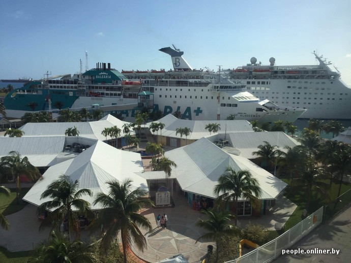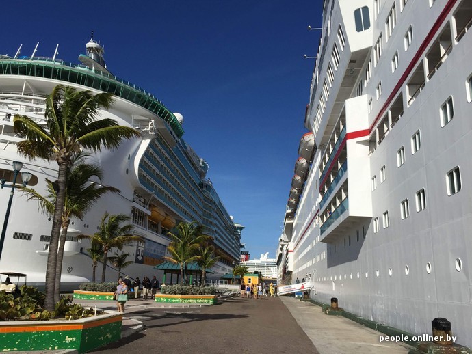 Наш лайнер ходит по Западным Багамам. Стартует из одинокого порта в Джексонвилле. Потом день в море, прибываем в Нассау, столицу Багам. Сами Багамы обшарпанные, бедные, но людей возят на Paradise Island, где совсем другая жизнь, огромный комплекс из отелей, аквариумов, торговых центров, пляжей.